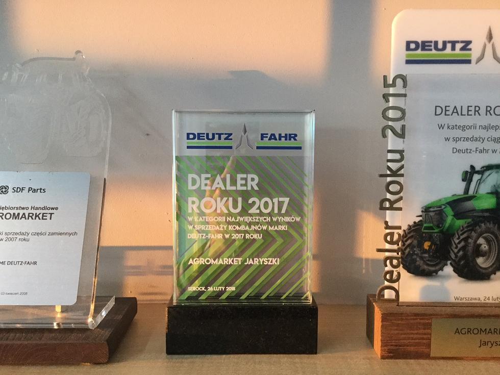 Z wielką przyjemnością pragniemy poinformować, że firma AGROMARKET JARYSZKI po raz kolejny została nagrodzona statuetką „Dealera Roku” przyznawaną przez zarząd SDF Group za największą sprzedaż produktów marki DEUTZ-FAHR. W roku 2017 nasza firma była bezkonkurencyjna w sprzedaży kombajnów zbożowych zajmując pierwsze miejsce, oraz drugie pod względem ilości sprzedanych ciągników rolniczych. Cieszymy się z tego wyróżnienia i dziękujemy Państwu za zaufanie jakim nas obdarzyliście wybierając Agromarket jako swojego partnera. Wiemy że bez Was nie było by tej nagrody, dlatego obiecujemy nadal podnosić nasz standard obsługi sprzedażowej i serwisowej maszyn, by kolejne zakupy były jeszcze bardziej przyjemne i profesjonalne.